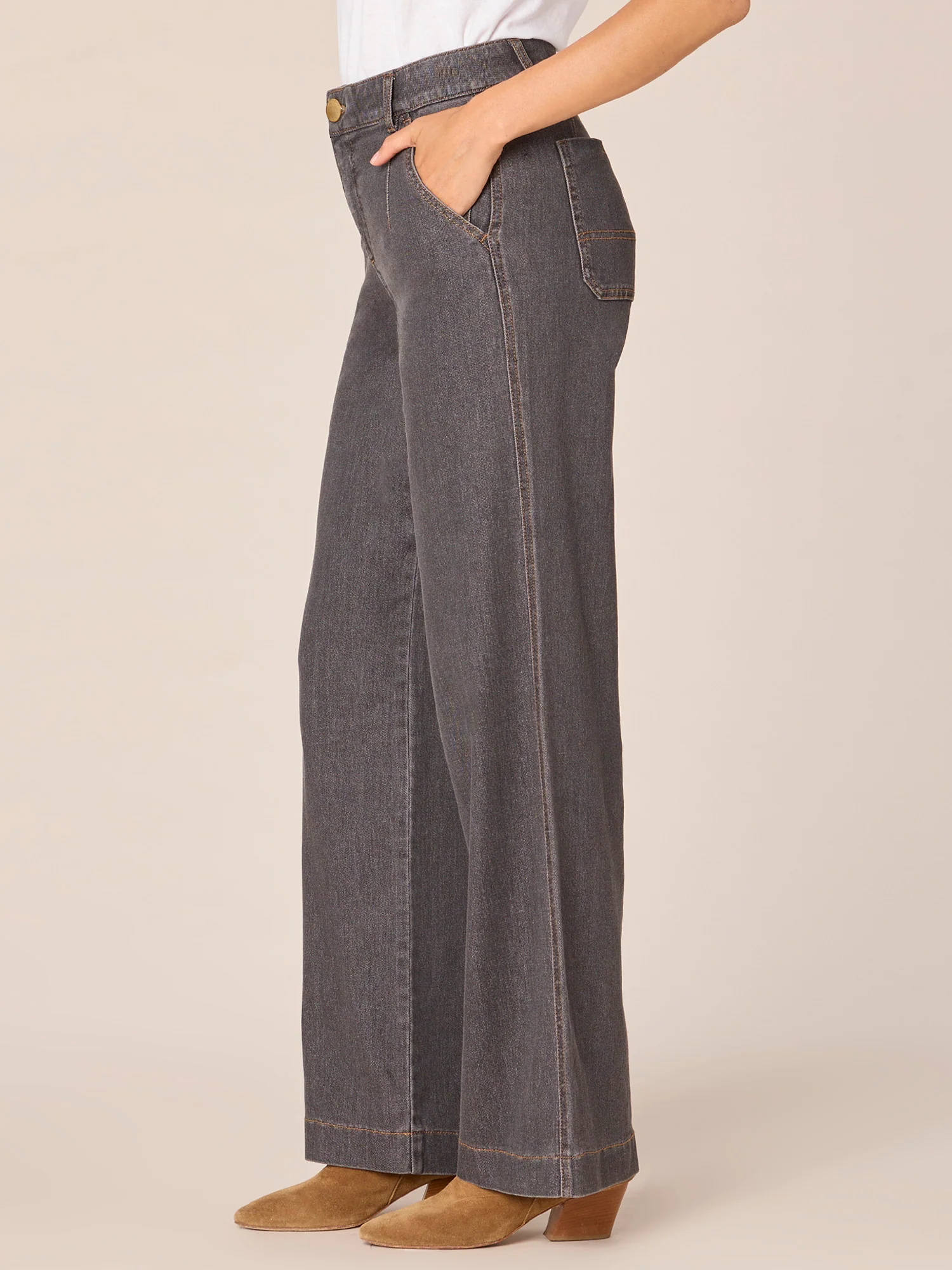 The "Ab"solution® Wide Leg is fitted through the hips with a relaxed, wide opening through the legs. This pair is engineered with "Ab"solution® fit technology to smooth, support, and enhance your shape, as well as on-trend design details like a V-yoke, front dart seams, and slash pockets.