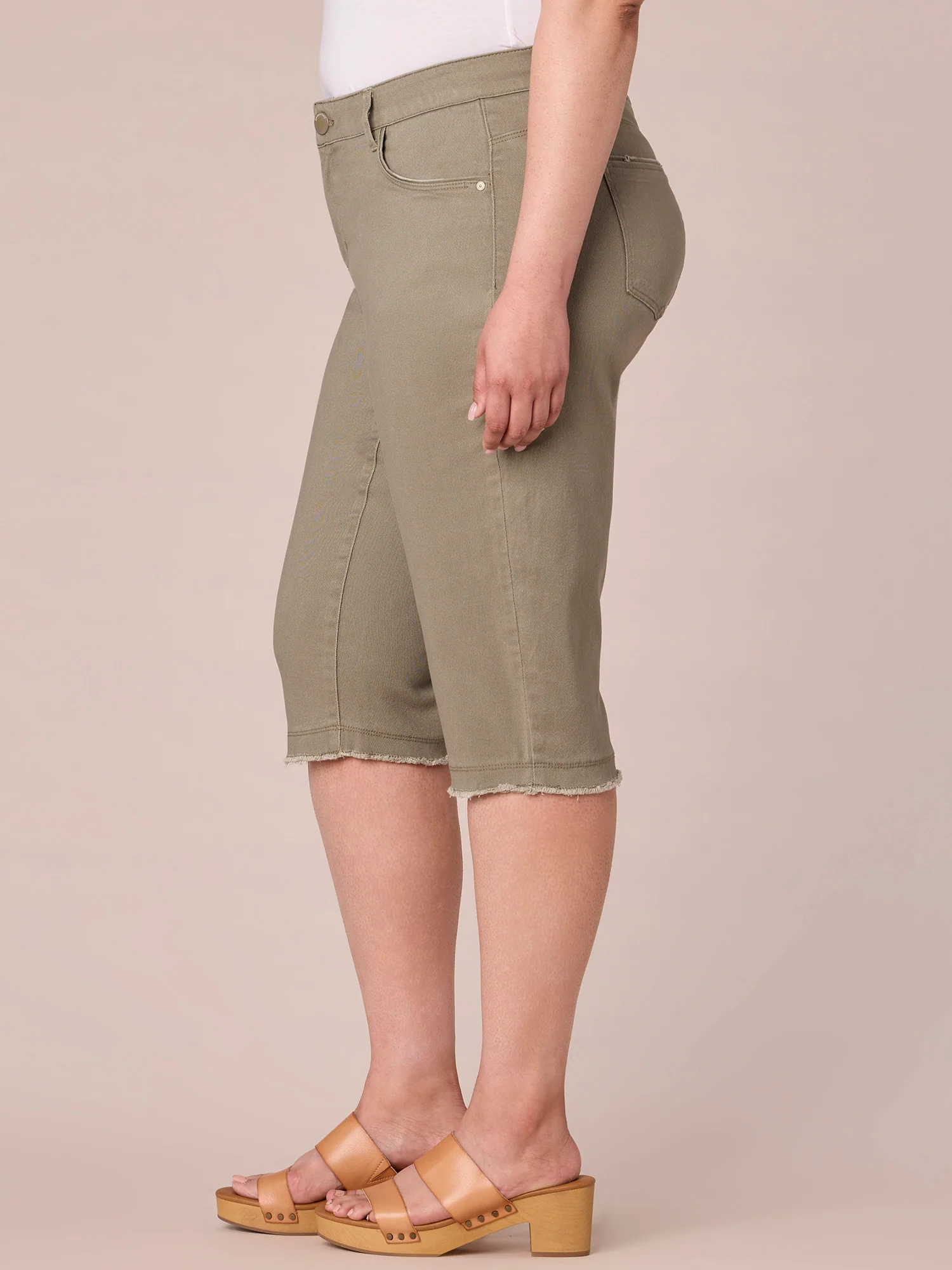 A well-rounded wardrobe starts with transitional pieces you can wear now and later, like these plus size “Ab”solution® Skimmers. Let your non-denim pants do the talking, with a five-pocket styling, frayed hem that hits below the knee, and a sophisticated shade of green. Our signature fit technology keeps you looking and feeling your best, with a sweetheart shaped yoke, power mesh panels, and strategically placed back pockets.