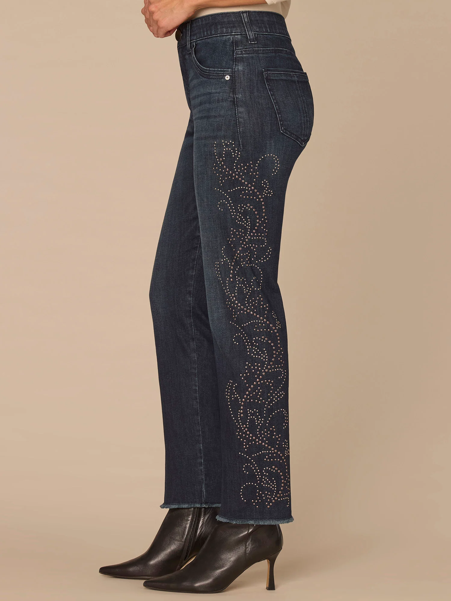 Our Slim Straight jean is a slimmer alternative to the classic straight-leg. It fits closely through the hips and legs, finishing with a relaxed, ankle-length opening. Engineered with "Ab"solution® fit technology to smooth, support, and enhance your shape, as well as a Western style stud motif and frayed hem.