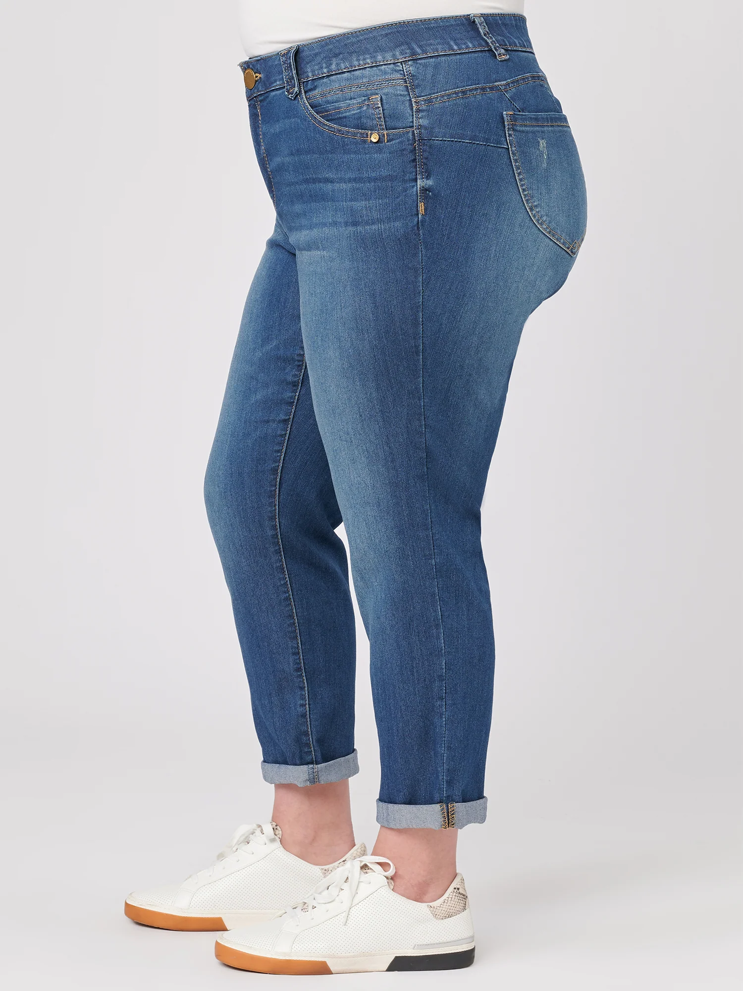 The "Ab"solution® Ankle Straight Leg jean in plus sizing is a relaxed, slightly slim straight-leg silhouette with an ankle-length hem. Engineered with our signature fit technology—giving you everything from a flatter tummy to a perkier rear view.